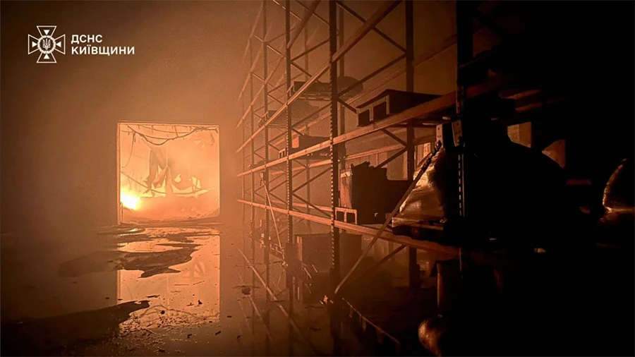 В результате ночной вражеской атаки БПЛА в городе Яготин Киевской области возник пожар на территории складского комплекса.